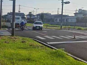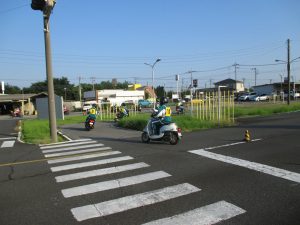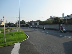 前回に引き続き、当校指導員による事故場面のデモンストレーションを行いました!原付バイクが絡む事故で多いのが交差点での右直事故(直進車と右折車の事故)です。