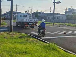原付バイクで貨物トラックのすぐ後ろを車間距離を取らず走った場合に対向車右折車から全く死角に入ってしまう、その結果、交差点で対向車が原付バイクに気づくのが遅れ、衝突してしまう